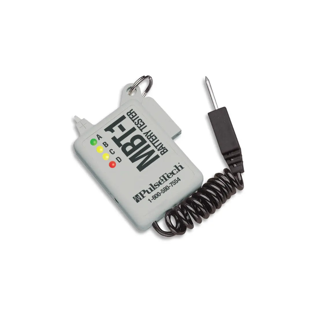 The PulseTech MBT-1 Battery Load Tester 741x800 quickly and easily checks for good and bad 12-volt lead-acid batteries. This pocket-sized battery load tester is small enough to fit on your key ring and features a rugged weather-resistant design. It includes a fixed post positive connector and a coil-corded moveable negative connector. When all of the color-coded LEDs light up the 12-volt battery is good. One LED lit will indicate a bad battery. Reverse polarity and over voltage protected.