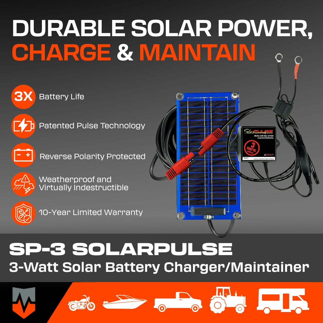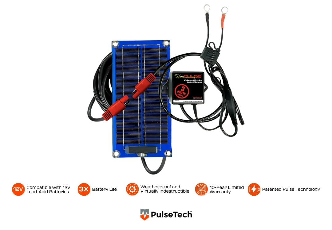 Harness the free energy of the sun to keep your 12-volt lead-acid batteries fully charged and ready. The SolarPulse SP-3 delivers 3 watts of clean, renewable solar power paired with PulseTech’s patented Pulse Technology to prevent sulfation, extend battery life up to 3X, and eliminate the worry of dead batteries.