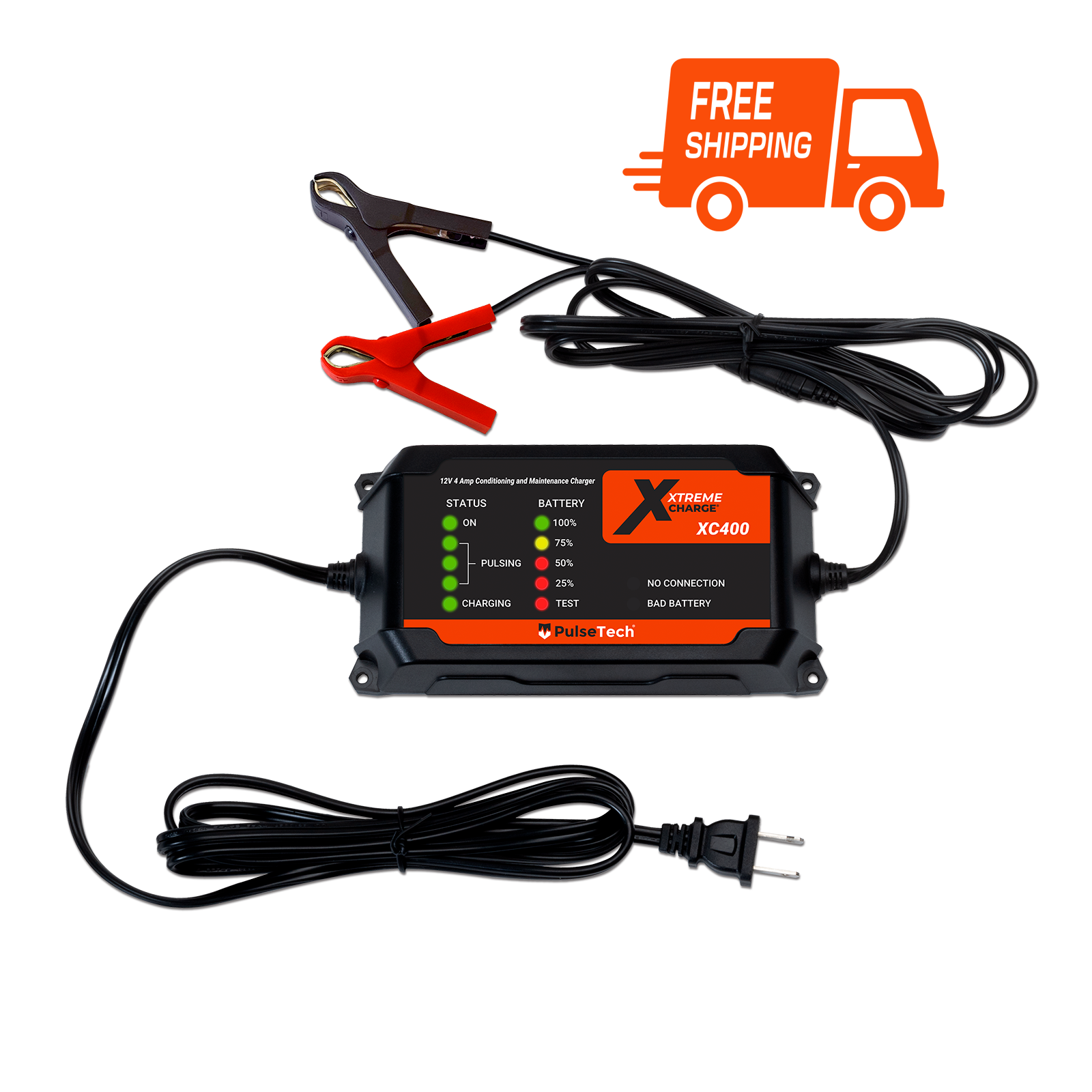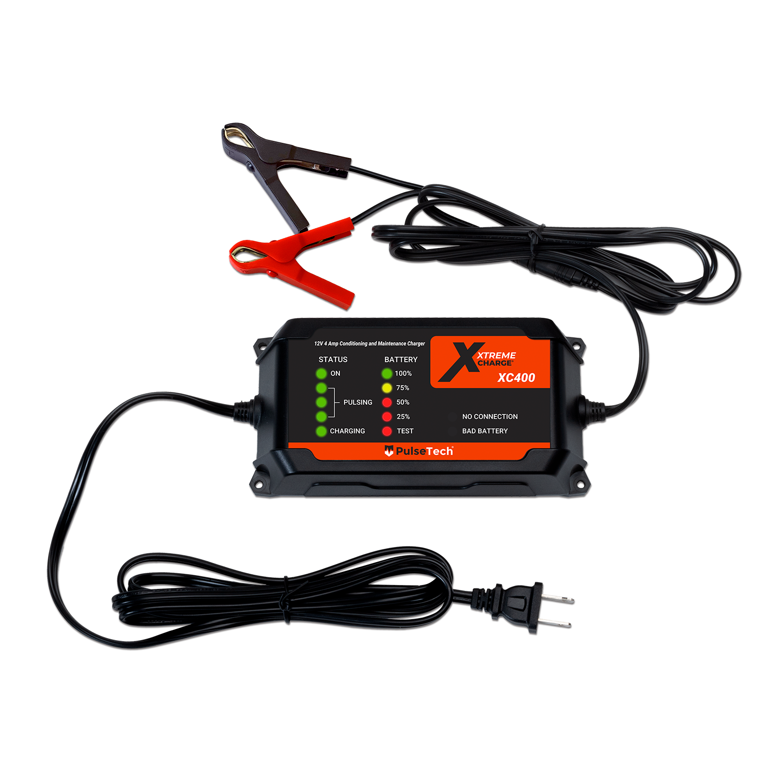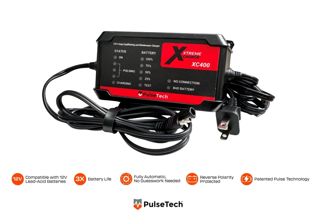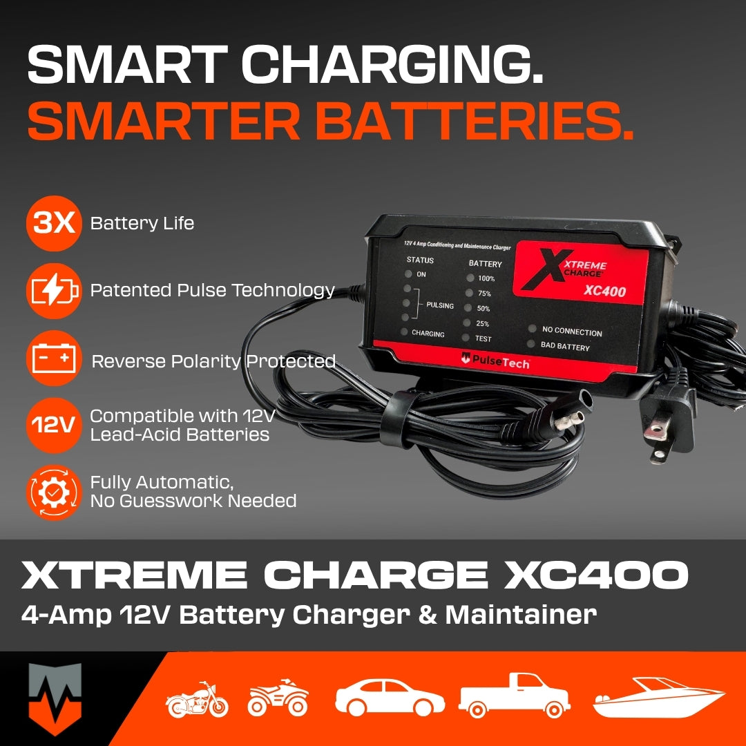 The Xtreme Charge XC400 is a high-performance 4-amp battery charger, maintainer, and conditioner purpose-built for 12-volt lead-acid batteries—including flooded, AGM, VRLA, and EFB types. Designed for professionals and serious battery owners alike, the XC400 utilizes a patented high-frequency Pulse Technology to optimize charge cycles, prevent sulfation, and extend battery life by up to 3X.