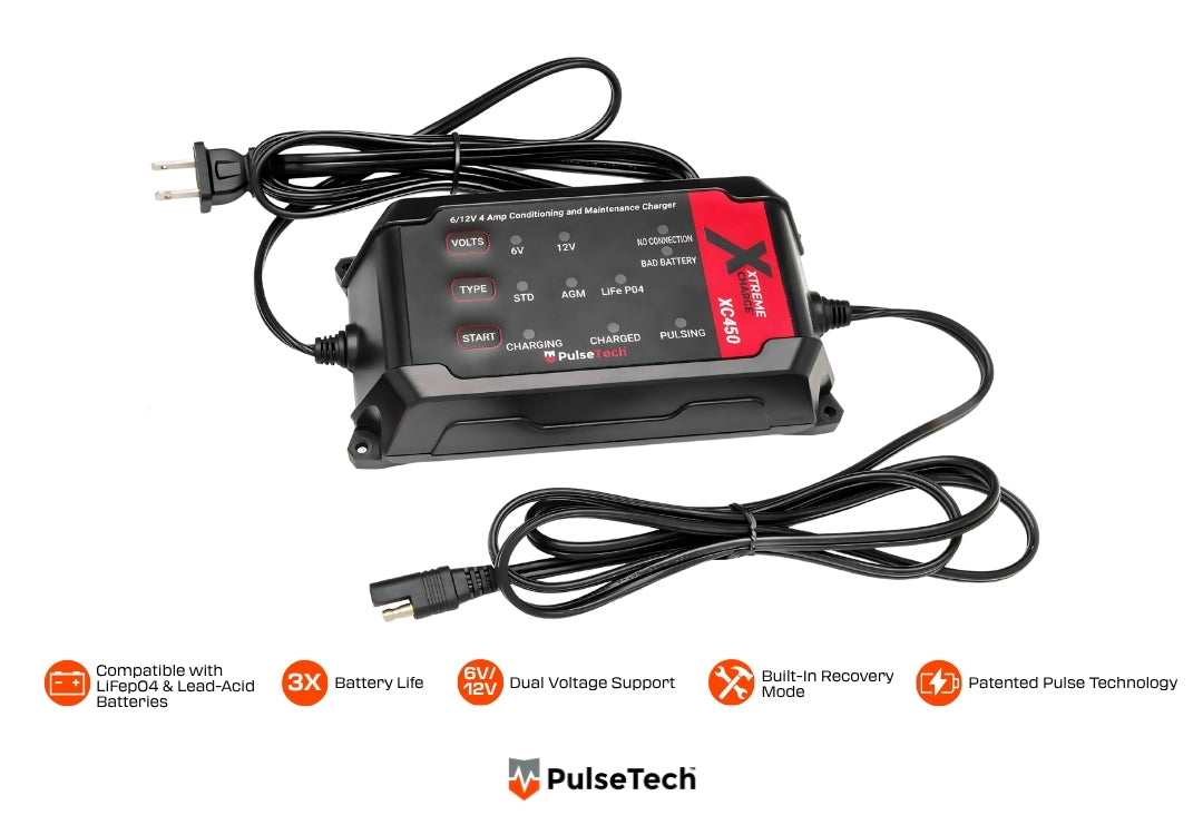 Equipped with PulseTech’s patented Pulse Technology, the XC450 not only charges—it revitalizes. By delivering 25,000 high-frequency pulses per second inside the battery plate, the XC450 actively prevents sulfation buildup and extends overall battery life by up to 3X.